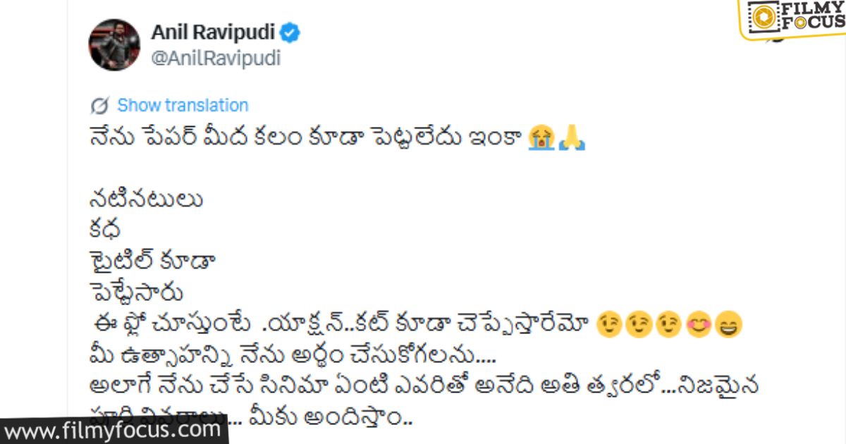 నేను కాగితం మీద కలం కూడా ఇంకా ట్టలేదు. కానీ, నటీనటులు, కథ, టైటిల్ను కొంతమంది పెట్టేశారు. ఈ ఫ్లో చూస్తుంటే యాక్షన్.. కట్ కూడా చెప్పేస్తారేమో. మీ ఉత్సాహాన్ని నేను అర్థం చేసుకోగలను. నేను చేసే సినిమా ఏంటి? ఎవరితో అనేది అతి త్వరలోనే చెబుతాను అని ఆ పోస్టులో రాసుకొచ్చారు అనిల్ రావిపూడి.