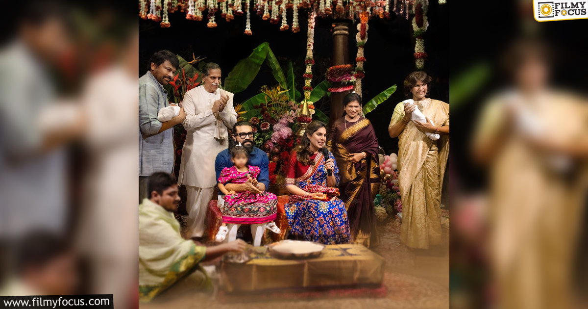 మెగా పవర్ స్టార్ రామ్ చరణ్, ఉపాసన దంపతులకి ఇటీవల కవలలు జన్మించిన సంగతి తెలిసిందే.జనవరి 31న ఉపాసనకి డెలివరీ అయ్యింది. ఇక కావలల్లో ఒకరు పాప, ఇంకొకరు బాబు ఉన్నారు. మనవడు కావాలనుకున్న చిరు(Chiranjeevi) కోరిక కూడా తీరింది. ఆ కవలలకు బారసాల వేడుకని కూడా నిర్వహించారు మెగా ఫ్యామిలీ మెంబర్స్. ఫిబ్రవరి 11న ఆ వేడుక ఘనంగా జరిగింది. ఈ సందర్భంగా.. బాబుకి శివ రామ్ అని,పాపకి అన్వీరా దేవి అని నామకరణం చేశారు.