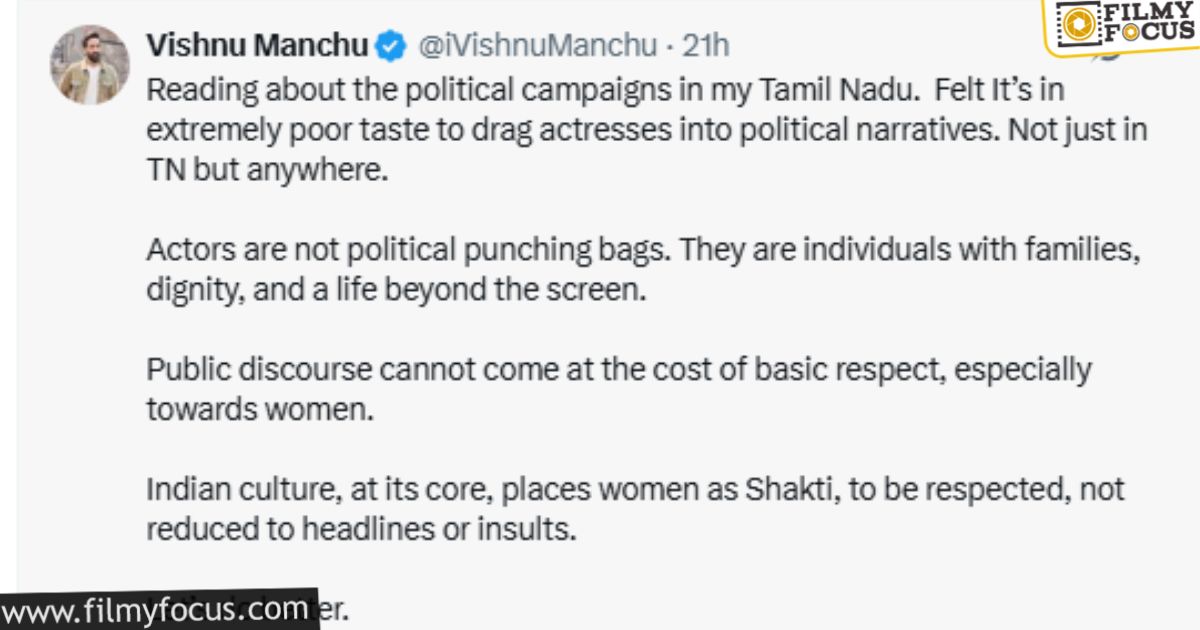 అయితే, ఈ విషయంలో మూవీ ఆర్టిస్ట్ అసోసియేషన్ అధ్యక్షుడు మంచు విష్ణు స్పందించారు. సోషల్ మీడియాలో పోస్టు పెట్టారు. రాజకీయ ప్రచారంలోకి సంబంధం లేని నటీమణుల ప్రస్తావన తీసుకురావడం సబబు కాదు. పాలిటిక్స్ విషయంలో తమిళనాడు సహా అన్నిచోట్లా ఇలాంటి వాతావరణమే కనిపిస్తోంది. పొలిటికల్ పంచ్ల కోసం నటీనటుల పేర్లను వాడుకోవడం సరికాదు. తెర వెనుక వారికంటూ వ్యక్తిగత జీవితం ఉంటుంది. వార్తల్లో హెడ్లైన్ల కోసం నటులను కించపరిచే విధంగా కామెంట్స్ చేయకూడదు అని అన్నారు.